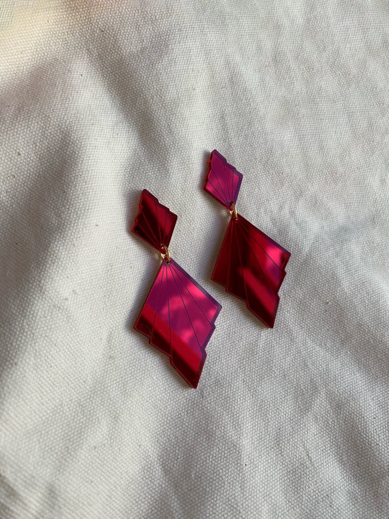 Features a beautiful art deco design, made with bright red mirrored acrylic on wood. The wood veneer and acrylic combination keeps these earrings light weight.
