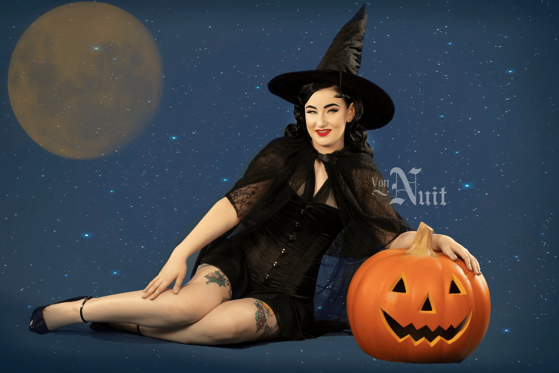 The Bewitched series was shot by Dynamite Dames, hair and makeup by Vivienne Vermouth, featuring black leather Irving Klaw-esque fetish heels and classic retro Halloween props to create a super cute pinup aesthetic.